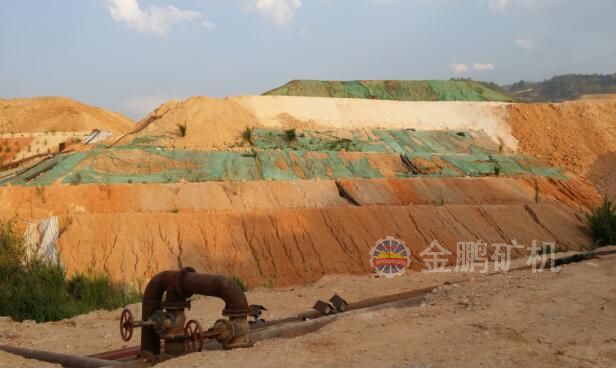 2、噴淋系統(tǒng):在鋪設(shè)好的礦堆上,設(shè)置噴淋系統(tǒng)。氰化溶液與礦堆反應(yīng)后,從礦堆底部滲出含金溶液(貴液),流入貴液池,經(jīng)貴液泵打入吸附柱,活性炭吸附后的溶液為貧液,貧液返回噴淋系統(tǒng)再利用。